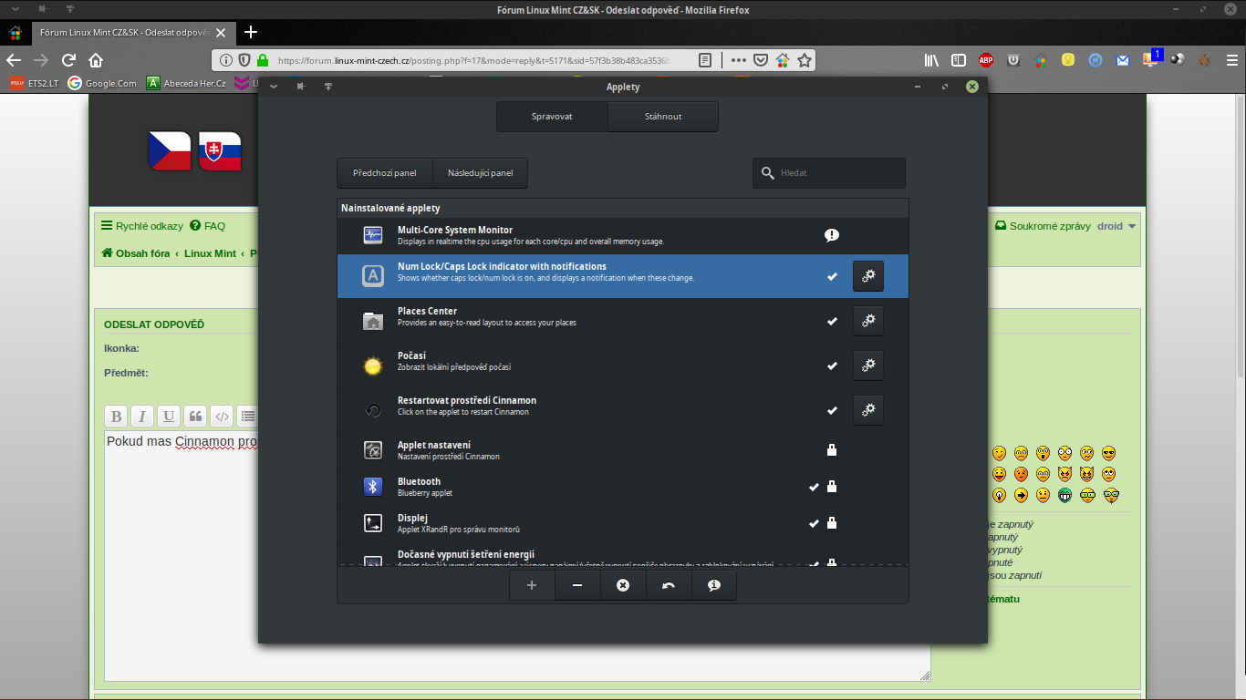Mám LM 19 Mate, tam jsem to nenašel ..., ale ten příkaz, co uvádím (z odkazu od JirkaZ), zafungoval a stále fungujePokud mas Cinnamon prostedi tak je indikator NUM i v apletech ktery se zobrazi na liste.