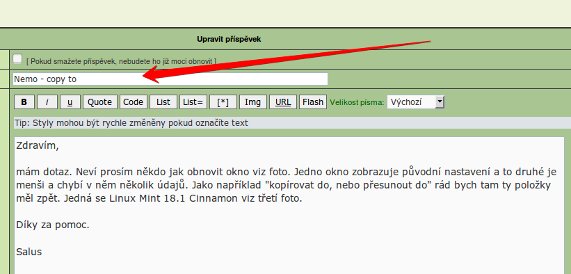 mám dotaz. Neví prosím někdo jak obnovit okno viz foto. Jedno okno zobrazuje původní nastavení a to druhé je menši a chybí v něm několik údajů. Jako například "kopírovat do, nebo přesunout do" rád bych tam ty položky měl zpět. Jedná se Linux Mint 18.1 Cinnamon viz třetí foto.