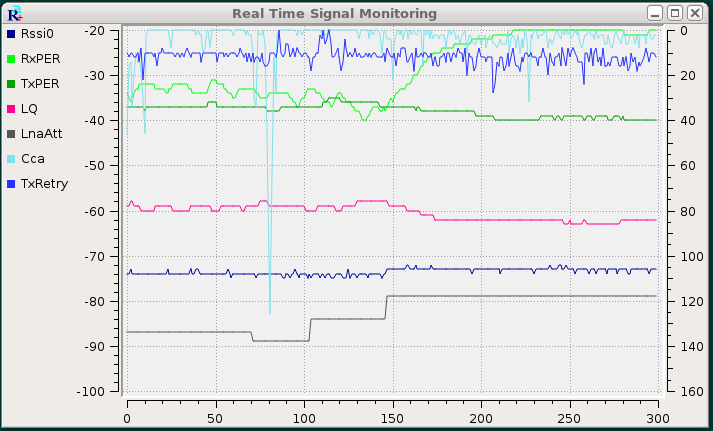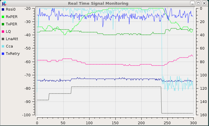 V pravej časti obr.popisuje nastavenie útlmu pri scanningu kedy je adaptér nastavený ako najcitlivejší. LnaAtt je na hodnote -99 dBm. Dramaticky ovšem stúpa chybovosť a parameter Cca (odhadu voľného kanálu).