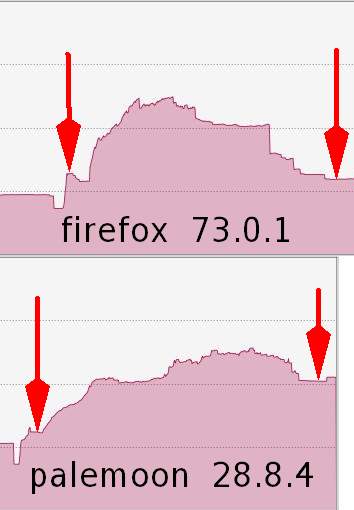 Levá šipka ukazuje stav před načtením stránek, pravá šipka po uvolnění záložek (vypnutí). Firefox se dostane na svojí původní hodnotu, Palemoon nikoliv. Čekal jsem asi minutu, jestli se to nějak skokově nezmění, ale nic se neděje. Jsou k mání nějaký pluginy (bartab tycho) ,ještě to vyzkouším, ale moc si od toho neslibuji ...