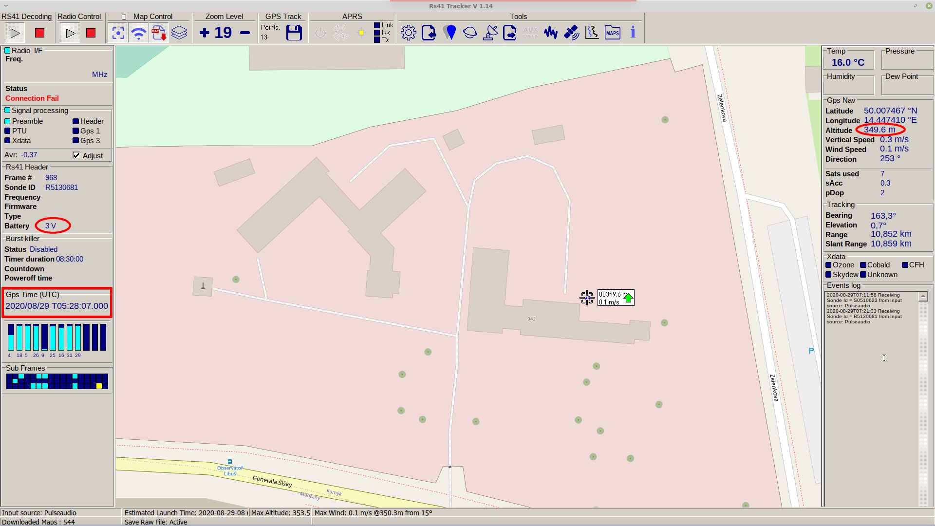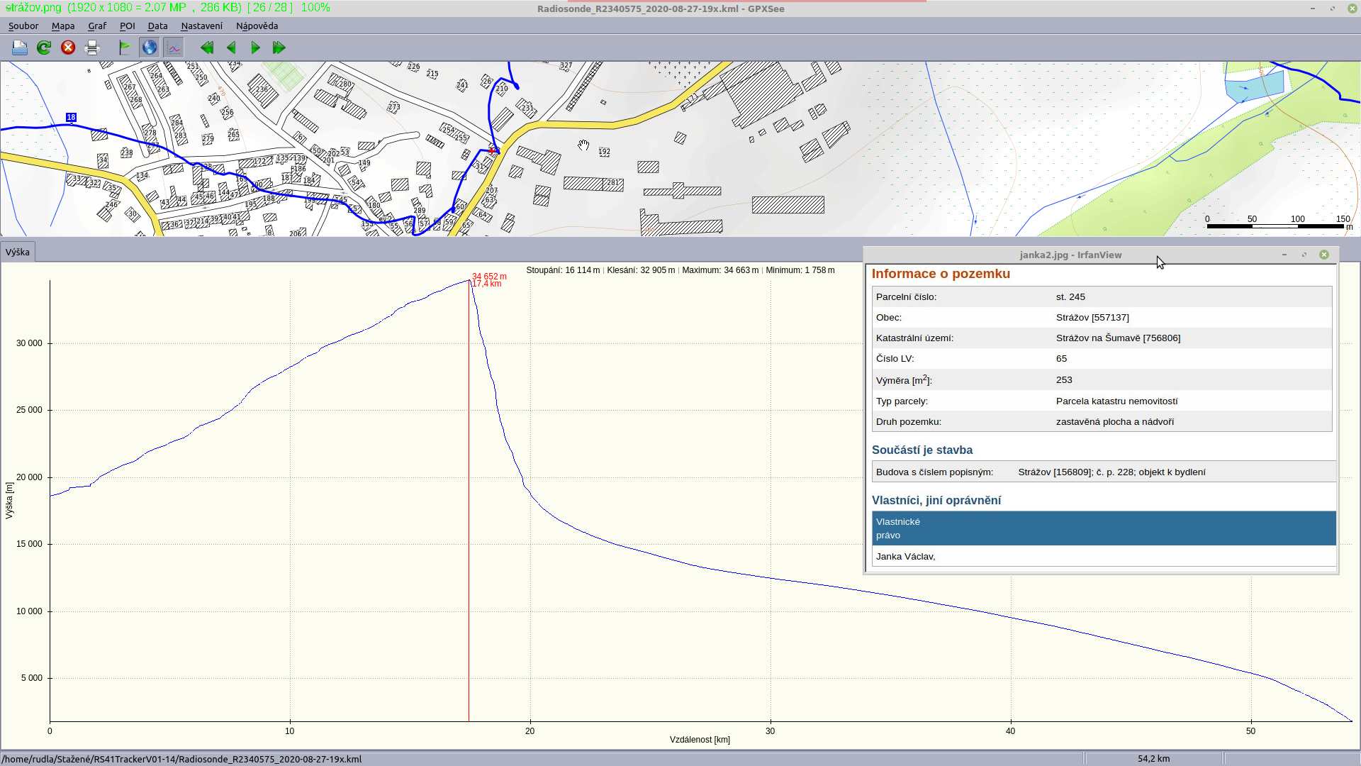 Co by to bylo za srandu, kdybych si nepustil SDR a nepokusil se o sondu ... Dnes je to obvzláště vypečené. Uložil jsem část trasy zde https://uloz.to/file/zG3ctM4IzP50/radio ... 27-19x-kml Pokud to přetáhnete do mapy.cz, uvidíte pouze trasu sondy R2340575, jak se motala kolem Stážova a spadla někde u Volenic, asi. Ale - kml data, která jsem uložil z programu Rs41 tracker jsem natáhnul do programu GPXsee a zobrazila se výšková trasa, jak jsem dekodoval data z vysílače GPS. A zajímalo mě jedno - kde balon prasknul. Ten zlom je poměrně pěkně vidět, tady jsou data: