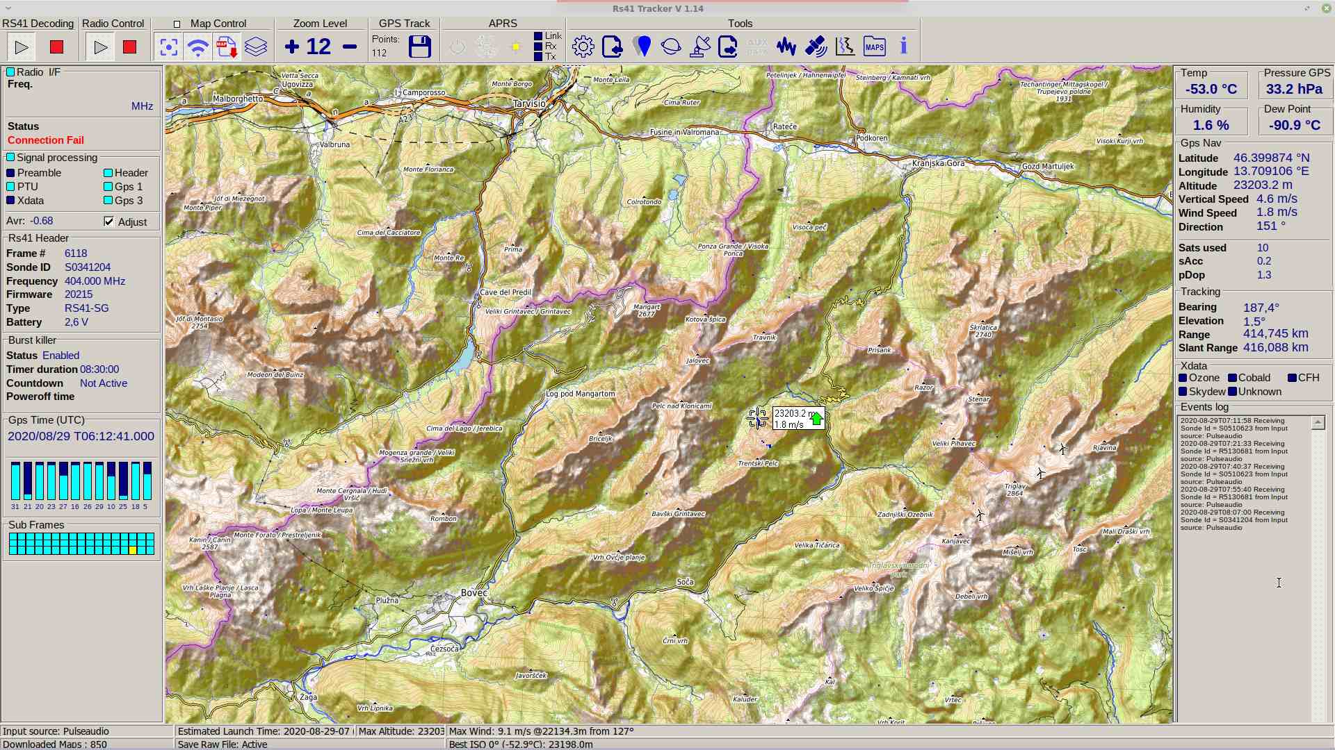 , šlo o sondu na rakousko - italsko - slovinském pomezí nedaleko od vrcholu Travnik 2378mnm. Vzdušnou čarou od Prahy cca 415km, to docela jde. Šlo o italskou sondu z Udine,viz https://radiosondy.info/sonde_archive.p ... r=S0341204