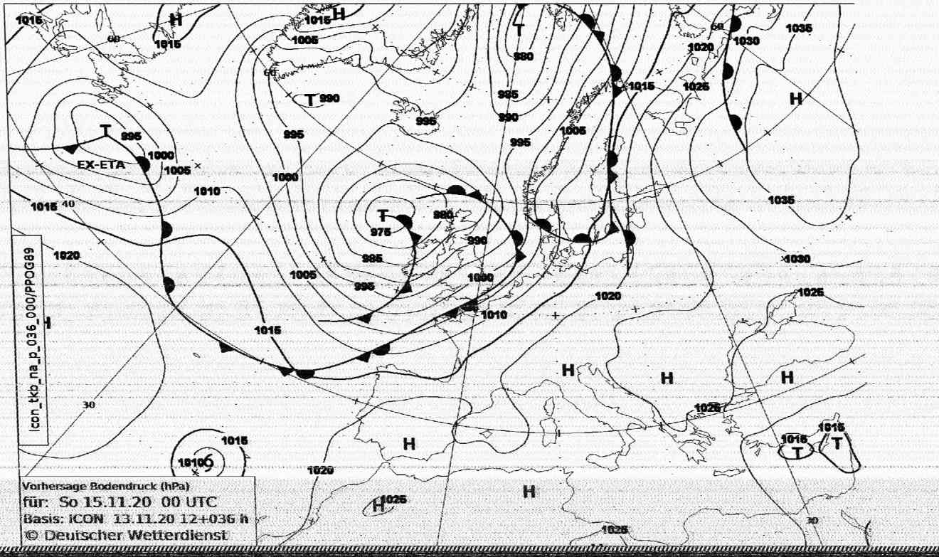 Jde o synoptickou mapu předpovědi na 15-11, jak je vidět z razítka. Tyto mapy a jiné informace vysílá německá meteo služba z Hamburku pro námořní plavbu. Poslouchat a dekodovat to může pochopitelně kdokoliv, takže stačí např. anténa miniwhip a příslušný software a máte o zábavu postaráno ... Pokud si tedy instalujete wine a nějaké win programy na dekodování ama nebo profi provozu, mělo by to v linuxu bez problému fungovat ...