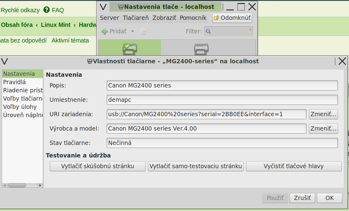 Keď si teda otvoril Nastavenia tlače - v Mate to nájdeš v Menu-Ovládacie centrum-Nastavenia tlače, tak všetko skontroluj či sedí vo Vlastnosti tlačiarne, môžeš vyskúšať skúšobnú tlač, samo-test.