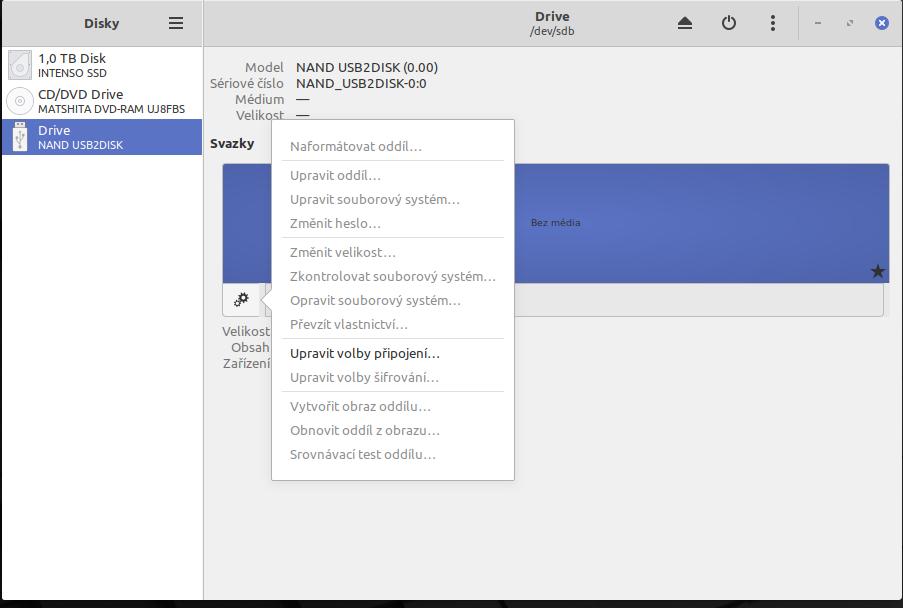 Bod připojení /dev/sdb lze nastavit, ale nic to nespraví. Viz obr.