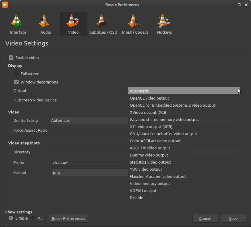 Nahraj si kernel 5.6.11 Zvládneš to? Dále můžeš v nastavení VLC zvolit videovýstup, viz printskrýn. Dále můžeš zvolit přehrávač mpv, ten je slušnej. A dále můžeš zvolit méně náročný OS.