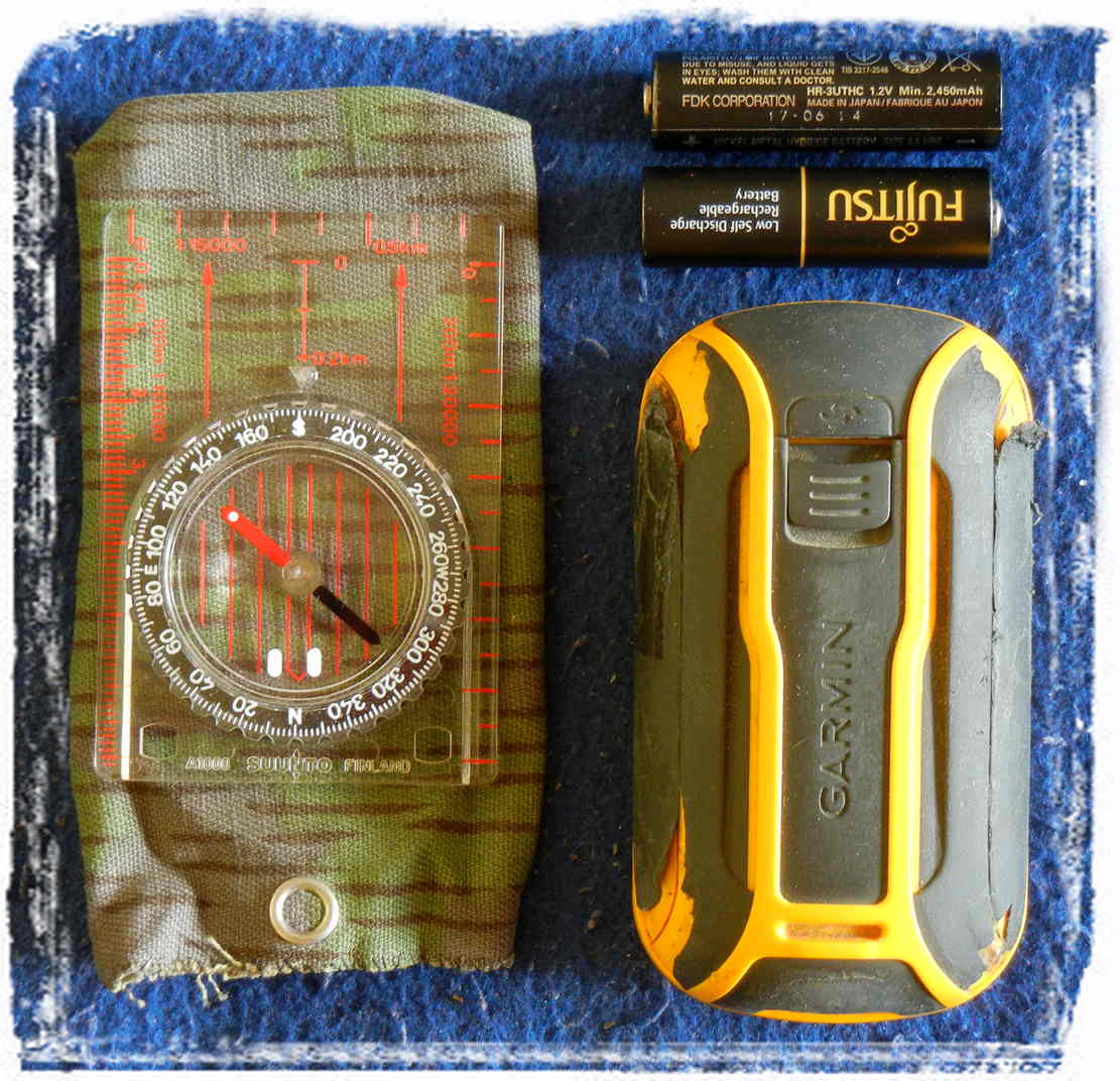Samozřejmě, že buzolu mám. Tady se podívej: Ale taky si všimni, jak je ten Garmin vorvanej. Má už něco za sebou. Ale furt funguje, tyhle baterie, resp. accu jsou dost dobrý. Několikrát abgejd menu, ještě ve widlích, zkouška různých TOPO map, nyní to používám převážně na záznam trasy. Mobil není tak přesnej. Je to Dakota 10, je to už veterán ...