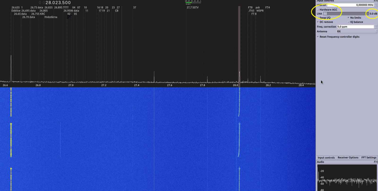 CB hotspotovým nadšencům https://www.cbhotspot.cz/o-nas nelze upřít vervu, s jakou se pustili do řešení komunikačního oříšku na občanském pásmu, a sice - jak se dovolat z Aše až do Ostravy základním výkonem, tj. 4W. Napřímo to nejde, hotspoty to umožní. Celý projekt si financují sami, na webu se dozvíte zákl. info. Je to založené na dobrovolnosti, komunikace je pro uživatele zdarma, žádný SIM karty, nic. Jen vhodná anténa a CB vysílačka. CB bylo na ústupu, největší rozmach byl patrný na začátku 90. let. S nástupem mobilů a internetu (skype) zájem postupně opadal. Hotspoty ale pásmo CB opět trochu oživily. Ale - stane se, že se něco splaší, vymkne z kontroly, zkrátka - něco se podělá, a pak to vypadá v éteru takto: Nevím tedy jak kdo, ale v dobré kvalitě zde slyším hotspot Ďáblice, tj. 26635 MHz. Ale - zapnuté SDR ukázalo další parazitní příjem, který tedy "coural", to je ta divná čára kolem 28,023 MHz, je to poměrně silné, zesílení, resp. zeslabení, bo nemám laděnou ant. na CB, ale pouze dipol 1.5m, je 0dB, a přesto beru hotspot v amatérském pásmu naprosto srozumitelně, s trochou šumu. Křížová modulace to není, to je vidět. To kdyby slyšel Kratoška, že mu síbíčkáři lezou do pásma, to by ho asi ranila mrtvice. Takže nebuďte překvapení, že uslyšíte CB i v amatérském pásmu, je to sice fopa, ale vcelku věřím tomu, že si toho některá zodpovědná figura všimne a signál z CW segmentu zmizí. Myslete pánové na Martinovo zdraví ...