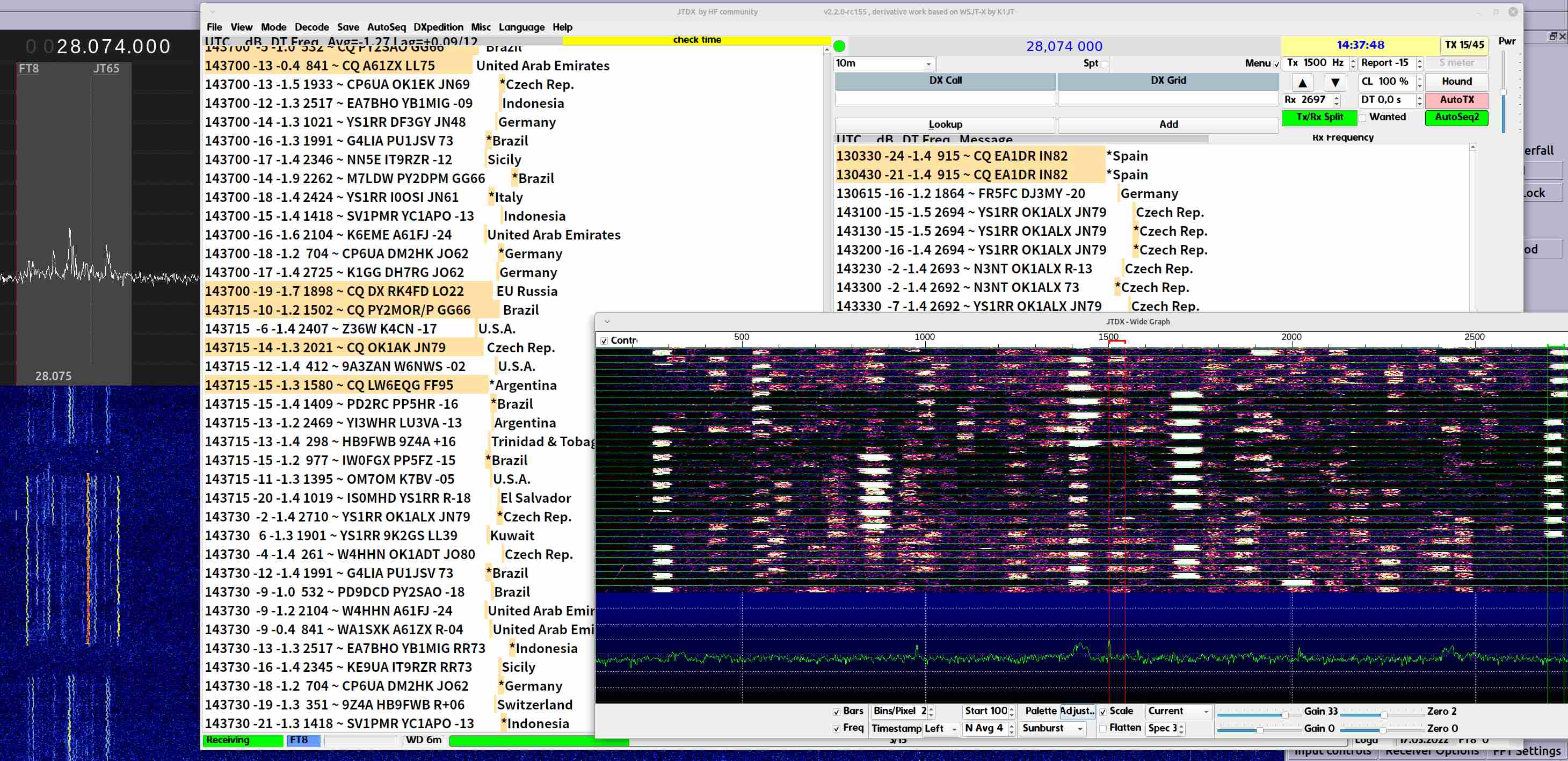 Dobré příjmové podmínky na horních pásmech KV trvají, dnes to na 10m na FT8 vypadalo nějak takto: