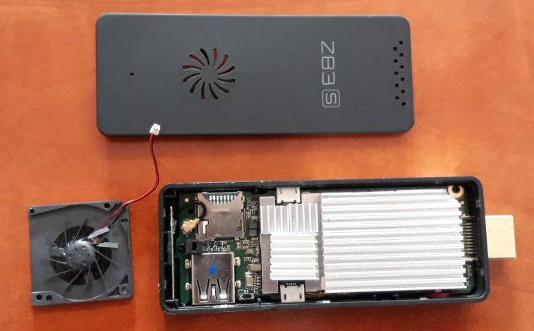 Léta mě ležel v šuplíku „pc stick“ AZW Z83S (tenkrát jsem ho koupil za 76 USD). Docela zajímavý Atom X5-Z8350, nainstalován W10 Home. Překvapivě (na základní věci) šlapal OK, akorát se dost hřál, a ten minivětráček s „muříma nožičkama“ nestíhal, i když točil na nejvyšší otáčky – zvuk byl příšerný, připomínal zubní vrtačku. Není se čemu divit, tento mini pc je celý uzavřen v tom platovém pouzdru.