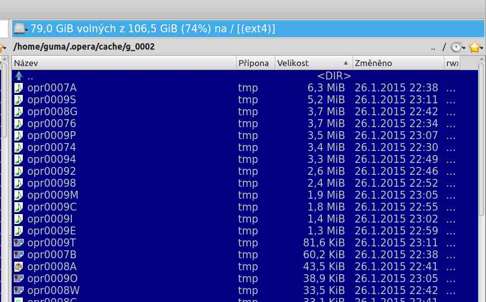 Je to tak - Opera je nejen výborná na web, ale umí i pár "fíglů", o kterých třeba nevíte. Dejme tomu, posloucháte na oblíbeném webu http://www.jango.com/music/Depeche+Mode?l=0 svojí porci hudby a druhej den se něco podělá a nejde internet. To se klidně může stát. Nevadí, jelikož jste si den předtím nasosali (a uložili) muziku, tak máte vyhráno. Jde o to, že Opera si poslouchané skladby "kešuje" a vy máte možnost si tyto mp3ky z keše kamkoliv zkopírovat a dále poslouchat. Takže popořadě - přes Správce softwaru instalujeme Operu. Je to verze 12.16 v češtině. V Nastavení - Pokročilé volby - Historie a cache - Disková cache nastavte maximum, tj, 400MB.To je docela podstatné. Jakmile si pustíte muziku, třeba ty depešáky, ale dá se poslouchat cokoliv, tak se v keši začnou tvořit soubory s příponou tmp . To je ono. Takže v adresáři Domov (zobrazit skryté soubory) - .opera - cache najdete v adresáři s názvem např. g_002 soubory s příp. tmp. Dejte řadit dle velikosti a máte vyhráno - jsou to poslouchané skladby, které se tam ukládají. Ty lze potom kamkoliv kopírovat a ukládat. Pokud je všechny označíte a přetáhnete do VLC, budou se jedna po druhý přehrávat, to je v pohodě. Takže přejmenovávání na příp. mp3 není nutné. Pro manipulaci se soubory používám "totalcomander", resp. linuxácký klon Krusader, lze instalovat přes Správce softwaru. Takto to vypadá v Krusaderu: