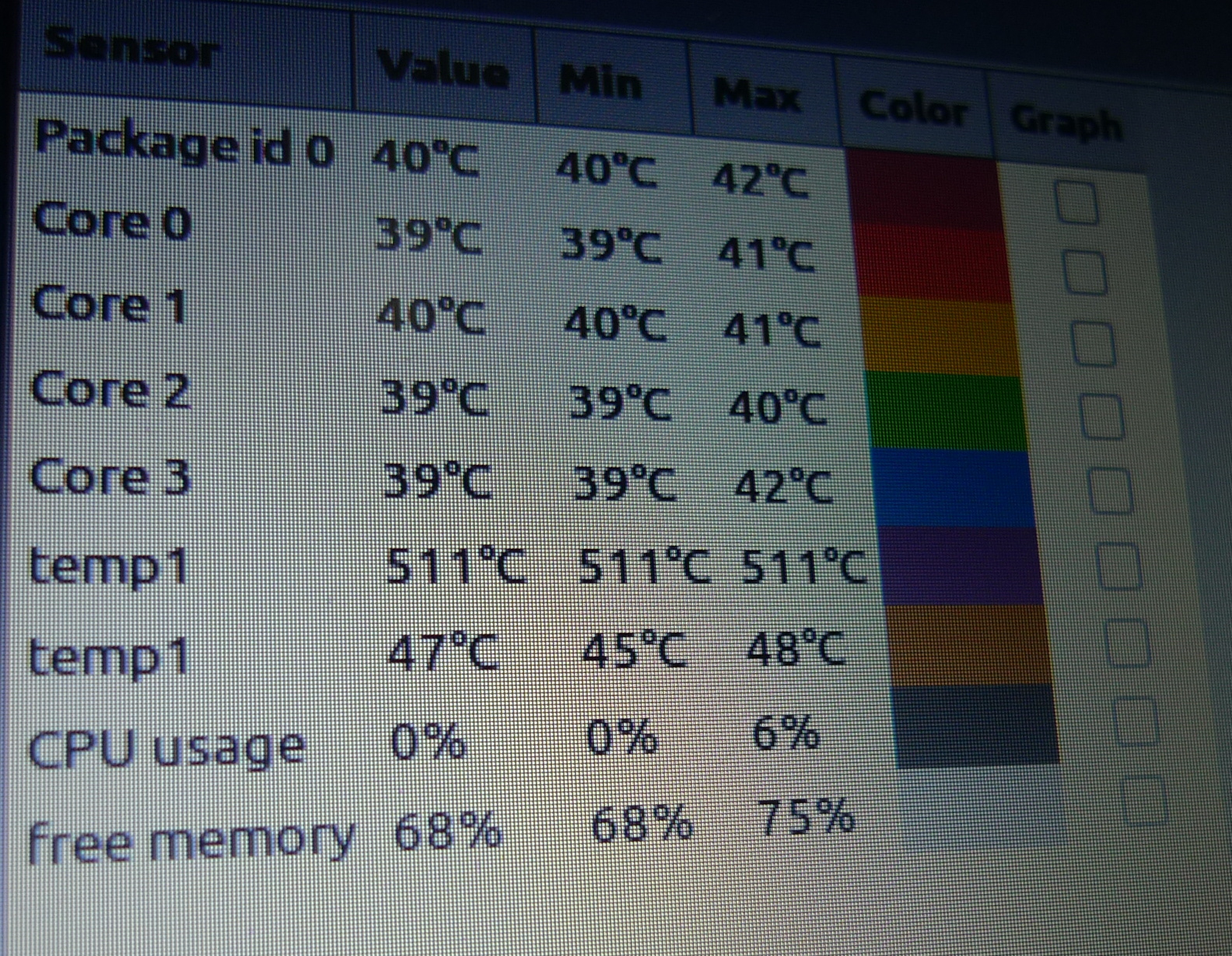 psensor ukazuje v řádku Temp1 511°C. Ostatní čidla ukazuji +- do 53°C.