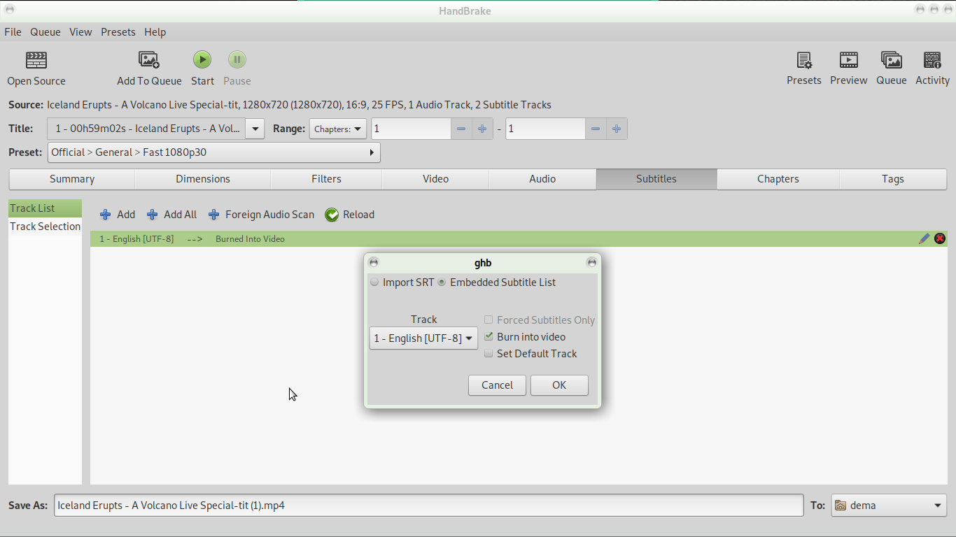 Handbrake dokáže napáliť už hotové titulky formátu .srt.