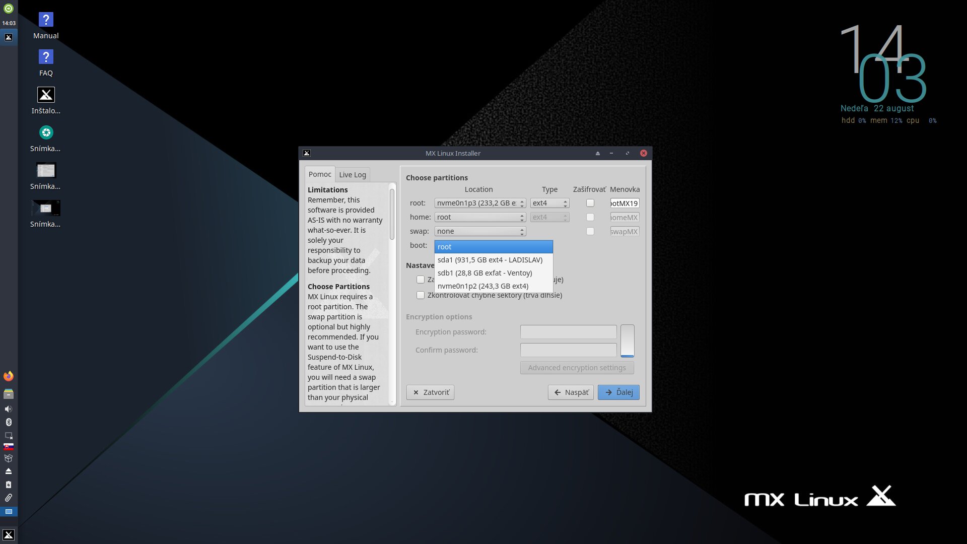 ...teraz namiesto budgie,chcem nainstalovat mx linux,lenze ked v instalatore mx vyberen pozadovany disk,tak uz neviem swapovat,ani zavadzac instalovat do boot...pri zavadzaci objavy bud cely disk,alebo vybrata oblast...mx som nikdy neinstaloval,instalator mx nepoznam...teraz neviem ako postupovat,aby MATE zostalo bez dotknutia... :idea: :idea: :idea:
