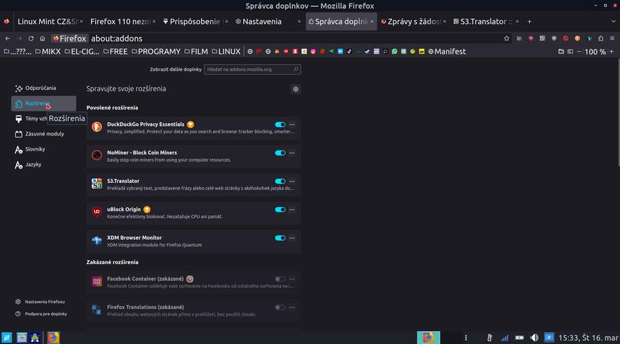 alojz: ...uz je 111-ka... - asi naštěstí jsem tuto Váši šifru nepochopil. Určitě budete mladý člověk, a mně je 77 a chápu už hůře. Ale nevadí: v předchozí radě jste mi doporučoval panel nástrojů, teď posíláte obraz Správce doplňků. Ale jak tam zajistit, aby se mi ikony doplňků, které nainstaluji, zobrazovaly vpravo nahoře v okně Firefoxu, o tom se nezmiňujete. Ale ani to už nevadí - přešel jsem na Ubuntu mate 22.10 a tam už se ikony doplňků objevují tak, jako to bývalo ve starších verzích. Takže už nebudu obtěžovat, ale děkuji za snahu.