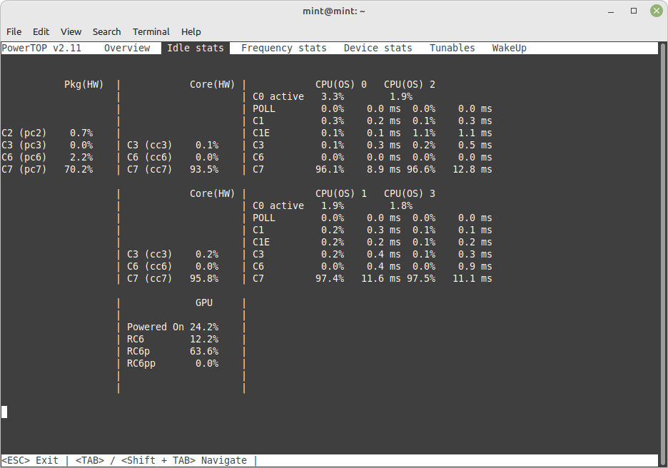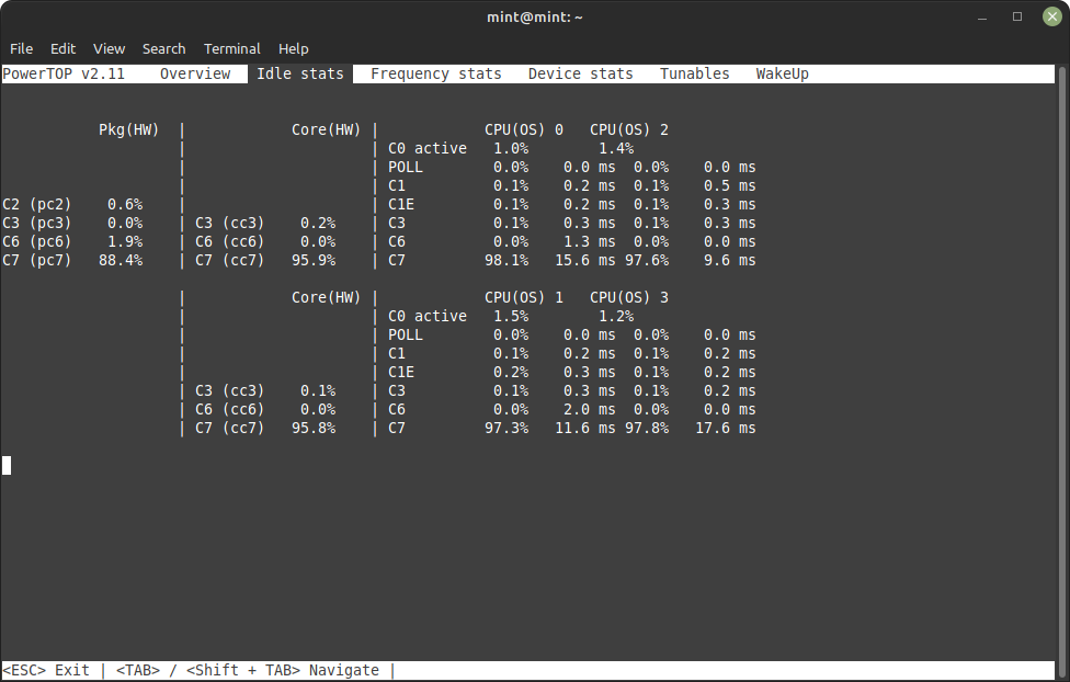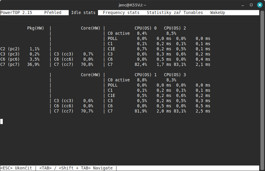 Díky moc za snahu. Ale co se týká zatížení procesoru a tím pádem i otáček větráku, nezaznamenal jsem žádnou změnu. Zkusil jsem Linux Mint 20.3 s jádrem 5.4 a LMDE 5 s jádrem 5.10. Všude je zatížení procesoru v idle stavu kolem 15 %. Což je nepřijatelné, když ve Win je zatížení 1 %, max. 2 %.menom píše: 07 úno 2025, 12:18 Mozes skusit LM 20.x a tam je jadro 5.4, kde to funguje dobre. Nainstaluj program powertop. Das v terminali sudo powertop a cez tab prepnes na kartu, kde ukaze stav cpu idle.